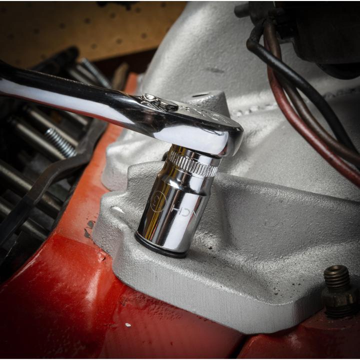 Living up to the reputation of the brand, GEARWRENCH full polish chrome sockets deliver unprecedented speed, strength, and access to almost any job. Large, hard-stamped markings allow for easy identification and can be easily recognized as SAE (double line) or metric (knurled line). Additionally, the off-corner loading design puts force on the flats of fasteners for improved durability and reduced fastener rounding. Available in standard, mid-length, and deep lengths, the GEARWRENCH sockets will get the job done.